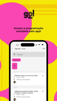 Com o aplicativo GO!RN 2025, você terá acesso completo à programação do evento, podendo consultar os detalhes de cada palestra e sessão. Além disso, o app permite que você receba notificações importantes para não perder nada do evento, participe de chats com outros participantes para trocar ideias e informações, explore a lista de palestrantes e conheça mais sobre eles. Através da área de networking, é possível adicionar novos contatos e expandir sua rede de relacionamentos. Também é possível interagir na timeline do evento, compartilhando suas ideias, curtindo postagens e aproveitando todas as funcionalidades que o app oferece para tornar sua experiência no evento ainda mais completa.